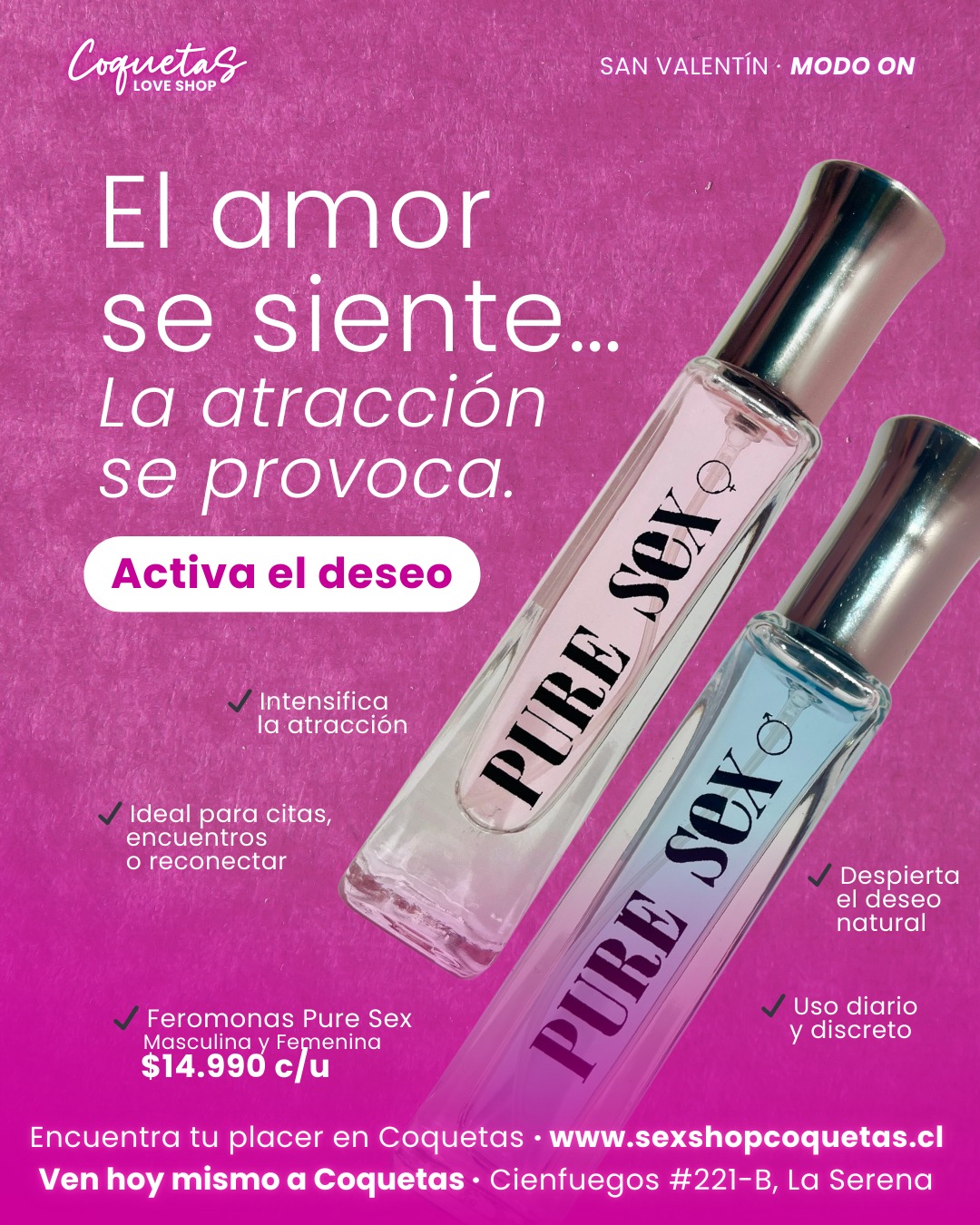Si buscas feromonas en La Serena o quieres comprar online con total discreción, en coquetasexshop.cl ofrecemos: